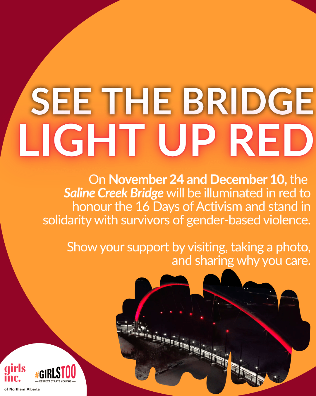 Join us as landmarks across the region light up in red to mark the beginning of the 16 Days of Activism Against Gender-Based Violence. This community-wide moment raises awareness, honours survivors, and reinforces our shared commitment to creating a future free from violence.